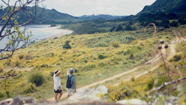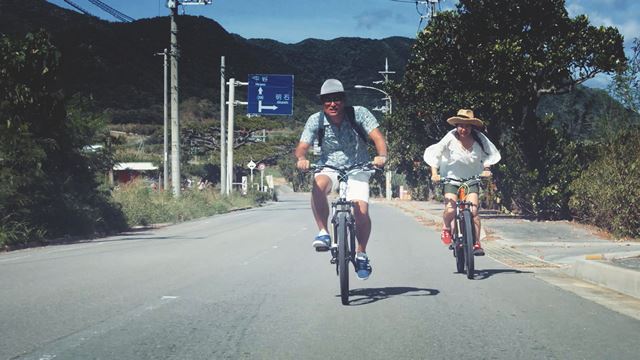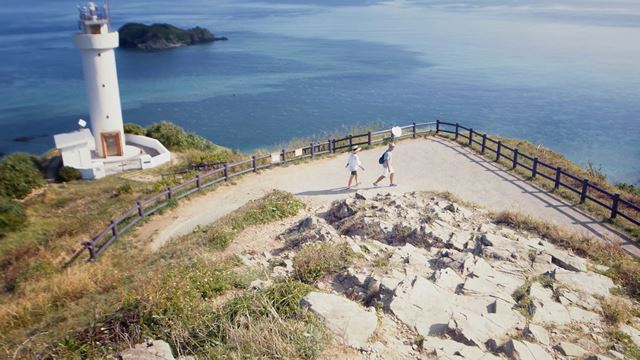 平久保崎灯台は、エメラルドグリーンの海が眼下に広がる絶景スポットとしても有名。そんな美しいスポットから、二人で手を取り合いながら、最南端の石垣市街地までの全長約40kmの距離を徒歩と自転車で移動します。
