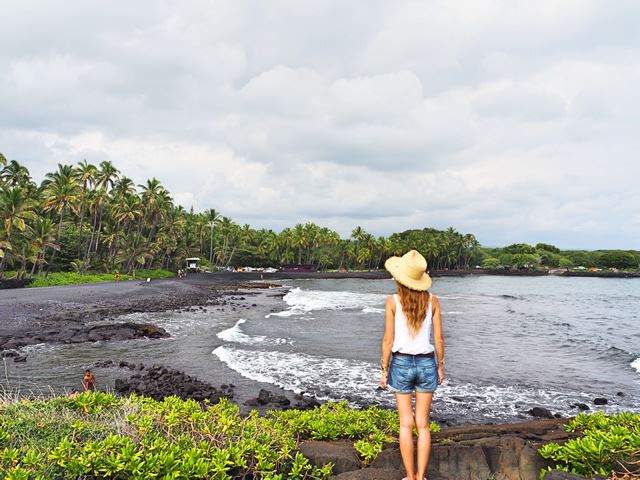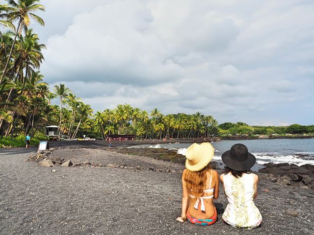 真っ黒な砂はサラサラでキラキラしていてさすが火山の島ハワイ島。
