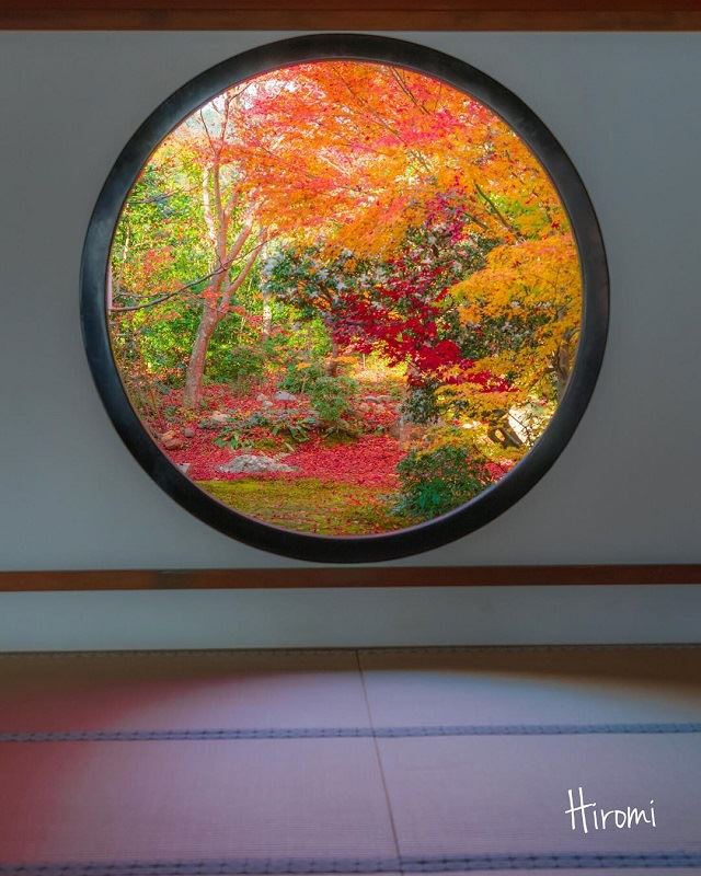 写真提供:@hiromitravelさんご本人コメント(抜粋) window of enlightment with view of autumnleaves there is square window of hesitation right side at genkoan #kyoto #japan