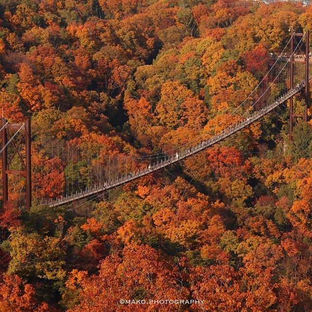 例年11月中旬から12月上旬にかけて紅葉時期を迎えます。スリル満点の大吊橋「星のブランコ」(橋長280m、高さ50m)から眺める、360度広がる色とりどりの紅葉は格別! 展望スポットからは星のブランコと紅葉の樹海、そして遠く市街地までの大パノラマが楽しめます。