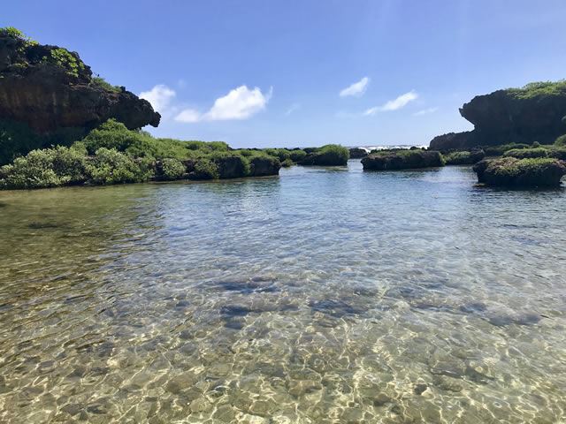 岩場の外側は荒々しい波が打ち付けていても、その海水が岩場の内側に入り込んでできた天然プールは、透明度が高くてとても穏やか。