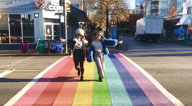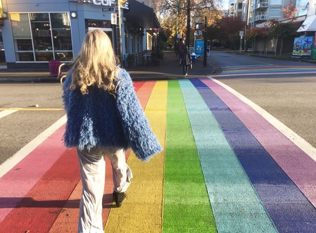 虹色の横断歩道はダウンタウンのウエストエンド地区にあります。横断歩道だけでなく、この地区周辺には虹色の旗なども多く見られます!