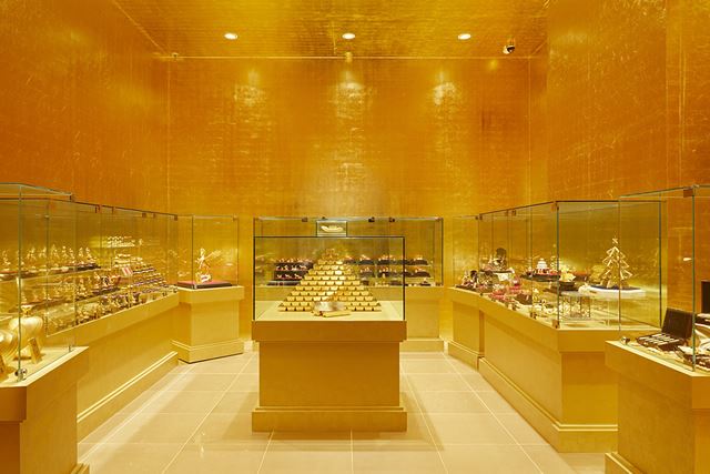 総額8億円相当の金が展示された注目の新スポット!天井や壁一面が金箔で覆われているほか、部屋の中央に鎮座する黄金のピラミッドは、なんと1本6,000万円相当の金塊!