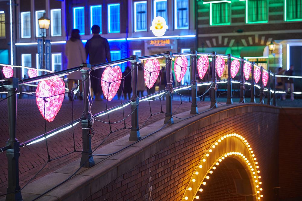 この冬は、場内16ヶ所にハートのスポットが登場!イチオシの青とハートのイルミネーションが運河に反射する「ハートの運河」は、ヨーロッパの街並みを華やかに彩ります。