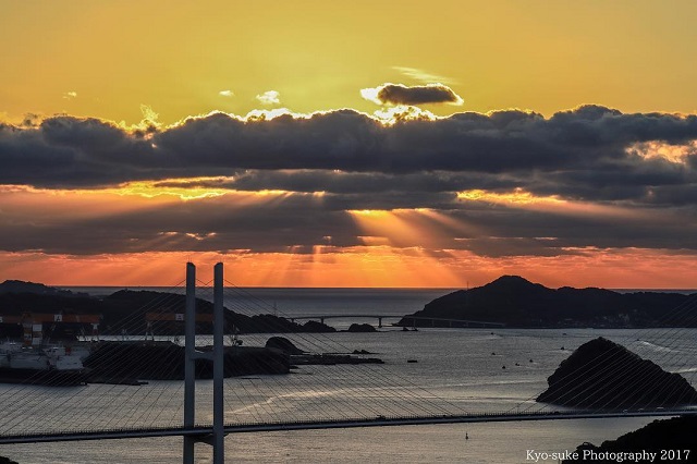 写真提供:@kyousukegramさんご本人コメント(抜粋)『鍋冠山展望台からの夕陽』光芒がたまらん.