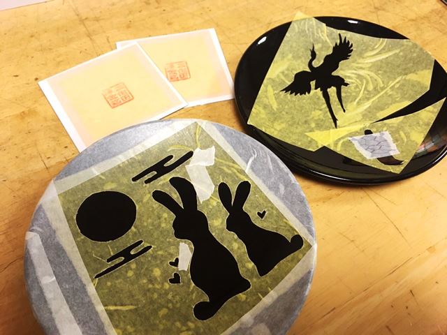 マスキングテープをカッターでくり抜き、小皿に貼りつけます。