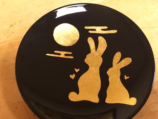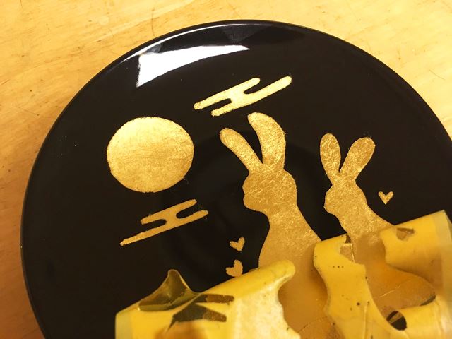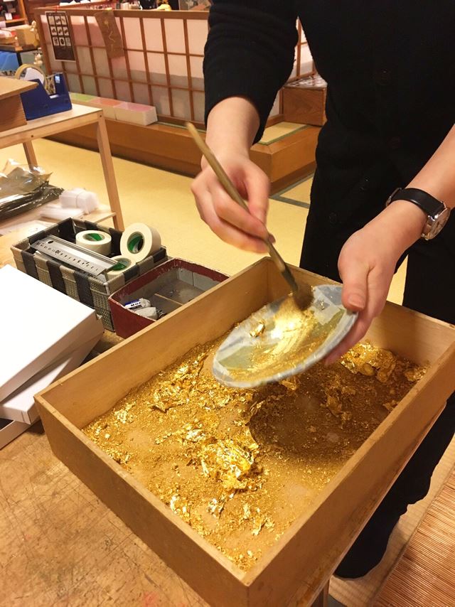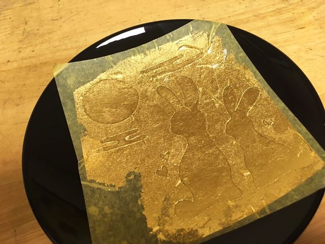 接着剤を塗り、その上に金箔を貼ります。厚さ0.0001mm!