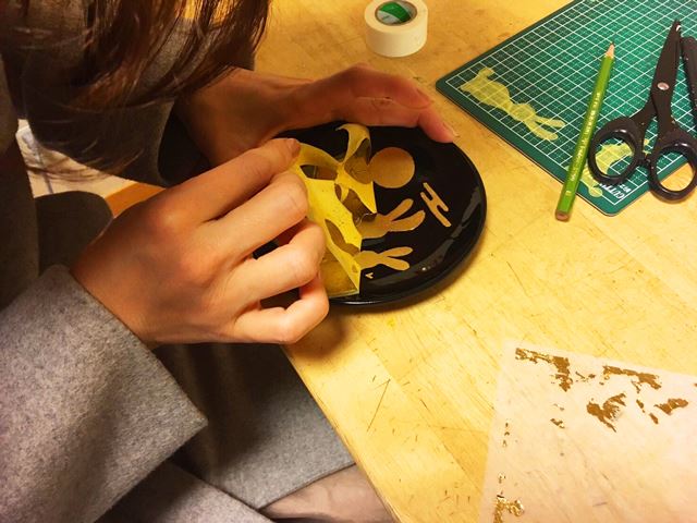 金箔を使ったオリジナルの丸皿を作ります。デザインを決め、マスキングテープに下書きをします。