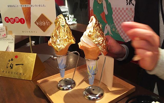 金箔ソフトクリームを持って写真を撮りたい人で行列ができます。味はというと、ミルクの濃いおいしいソフトクリームです。