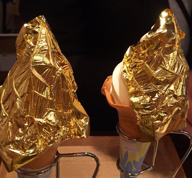 金を使ったスイーツを堪能します。大胆に金箔1枚をのせたソフトクリーム!