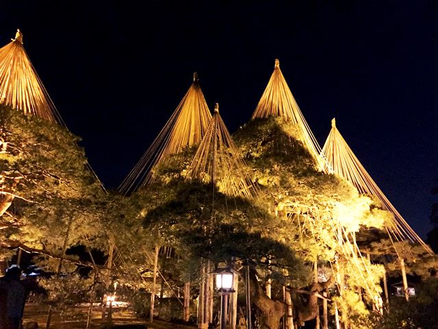 ライトアップされた雪吊りの松が黄金に輝き、美しい光景に感嘆の声があちこちで聞こえてきます。夜は寒いので防寒対策をしっかりして、幻想的な庭園散策を楽しんで下さいね。