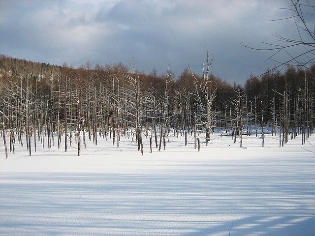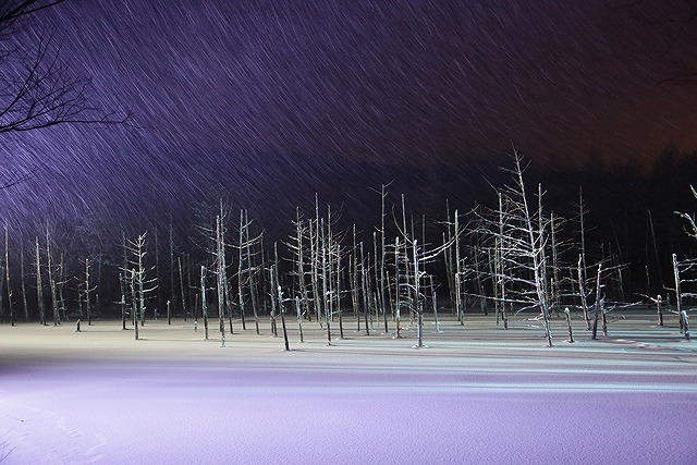 硫黄分を多く含む美瑛川の水が池のように溜まって青く見えることから、「青い池」と呼ばれるようになった奇跡の池。美瑛が誇る人気観光地で、冬は凍った青い池に雪が積もり純白に変化しています。