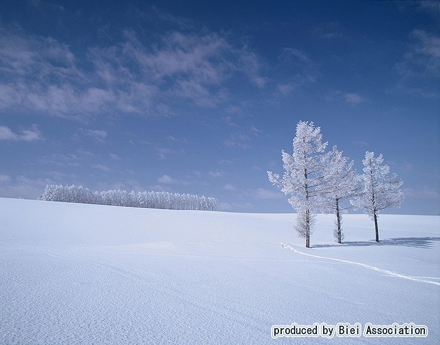 真っ白な大地と青空のコントラストが美しい映えるマイルドセブンの丘。美瑛町の中でも人気スポットです。タバコブランドのCMが撮影されたことから、こう呼ばれています。