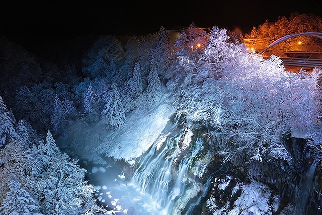 「青い池」と合わせて見たいスポットなのが、細く白い糸のように美瑛川へ流れ落ちる美しさが魅力の「白ひげの滝」。「青い池」と同じく、期間限定でライトアップが楽しめます。