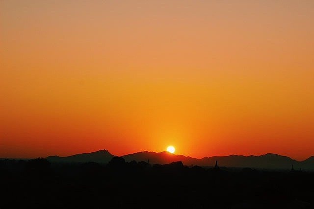 遺跡から見るサンライズは息をのむ美しさ。バガン遺跡群がいっきにオレンジ色につつまれます☆