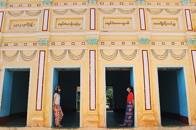 シュエズィーゴン・パゴダは、敷地内にある建物が何と言っても可愛い♪中でもここは、パステルカラーの壁に描かれているビルマ語とウォールアートが