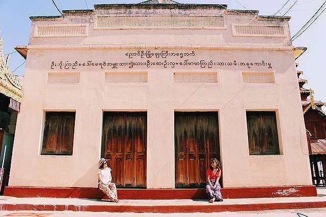 レトロな建物も発見♪ここは木の扉があり、同色のビルマ語との相性が抜群◎