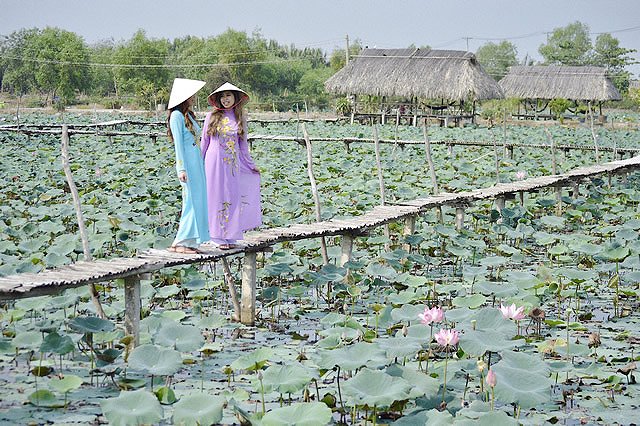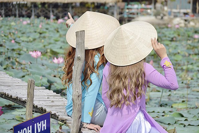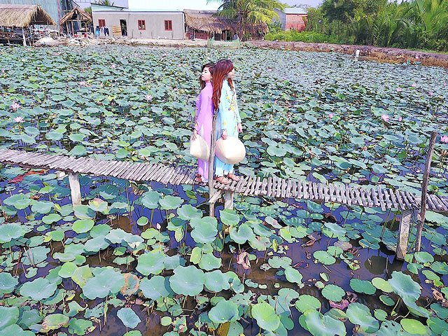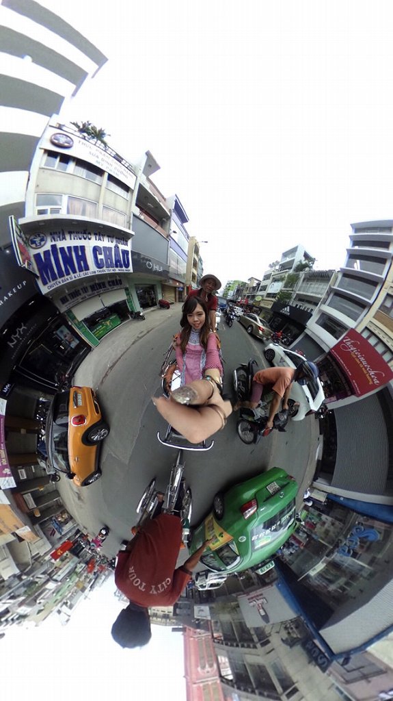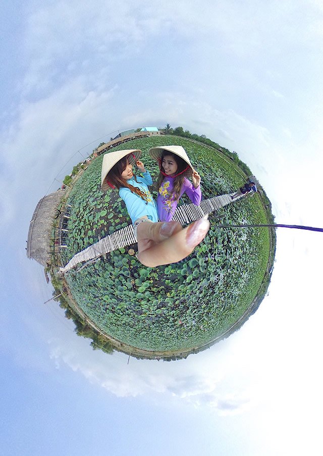 一面蓮の葉が広がっているので360度カメラthetaで撮影するとこのような写真になります!また蓮池にはアオザイを着て行くととても写真映えします!