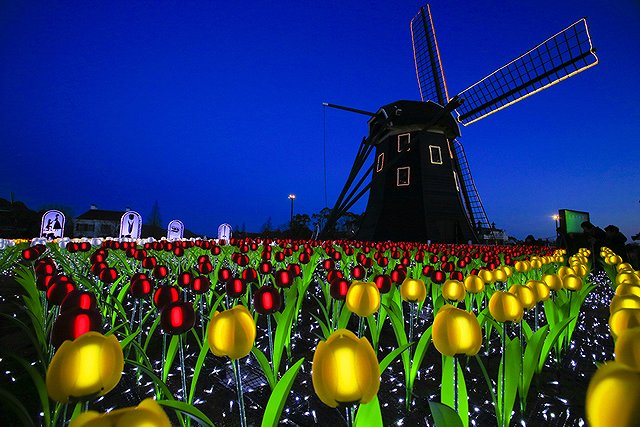 夜には、ライトアップされたチューリップと有機ELで輝く世界初の「光るチューリップ」や、世界最大1,300万球が輝く「光の王国」も同時開催中!