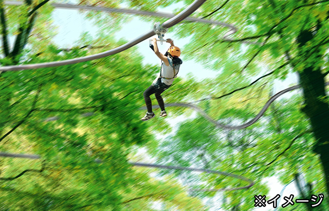この春、アドベンチャーパークに、日本初!日本最大!※ 1人乗りコースターアトラクション「天空レールコースター 疾風」が新登場!全長250m、高さ11mから急滑走!上下左右に体を揺らしながら、森の中を駆け抜けるスリルと爽快感が楽しめるよ!