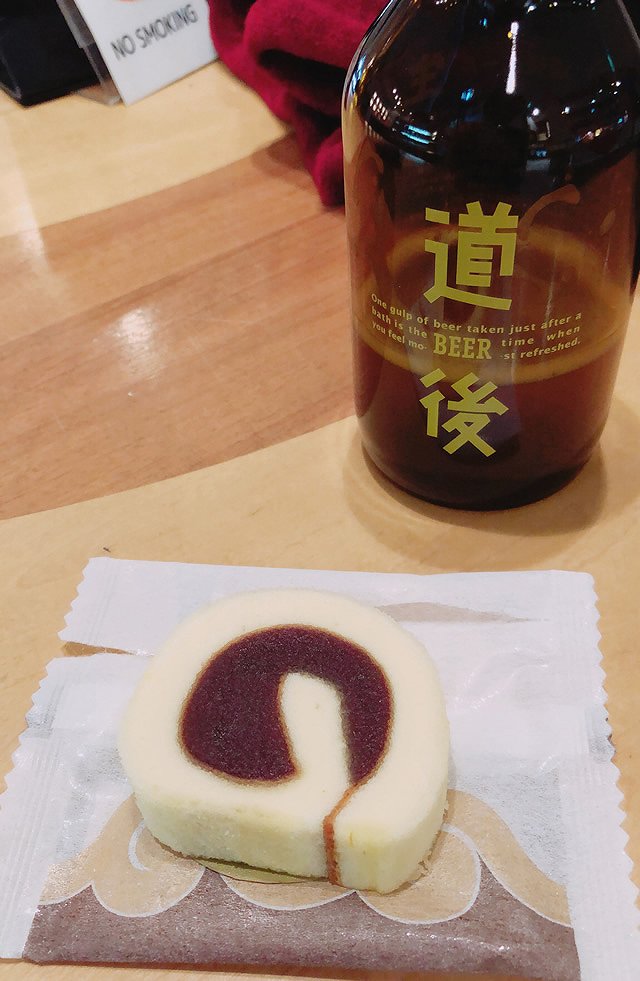 愛媛県のお土産といったらこちら「の」の字で有名な一六タルト。道後温泉本館の目の前の店舗では、バラ売りになっているタルトを店内で座って食べることができます。