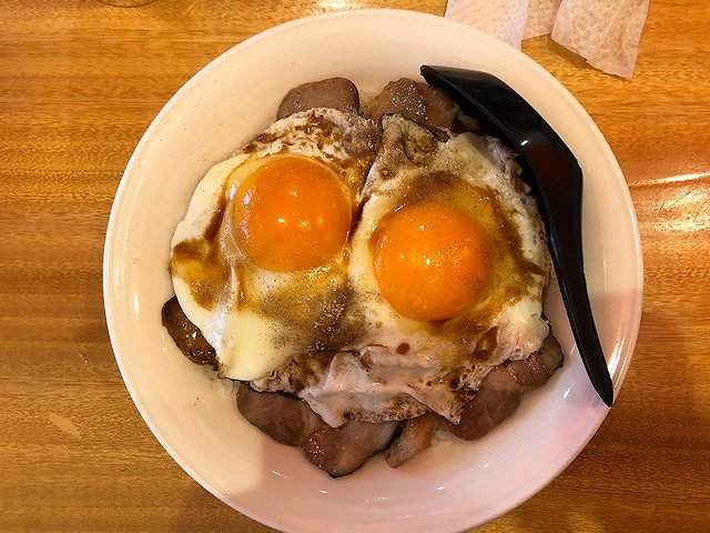 焼豚から溢れ出たジューシーな脂をまとったお米が、タレを含んだ焼豚と絡み合うその味は、「おいしい理由をすべてここに集めました!」と言わんばかりの衝撃です。トロッと半熟に仕上げた目玉焼きは、2つ乗っているので割ってご飯にからめて風味を変えて食べることも、一口で頬張って口の中いっぱいに卵を感じることもできるので、いちいち卵をどう食べるかで悩む必要もありません!