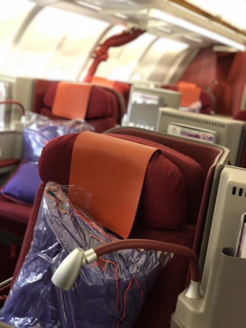ゆったりシートで香港に行く前からテンション上がる香港カラー。お布団もふかふか!