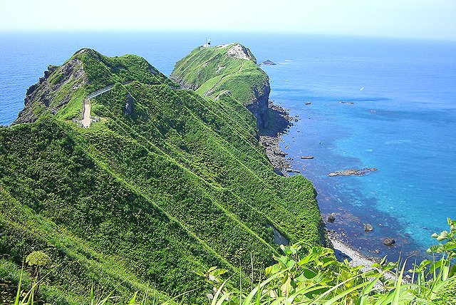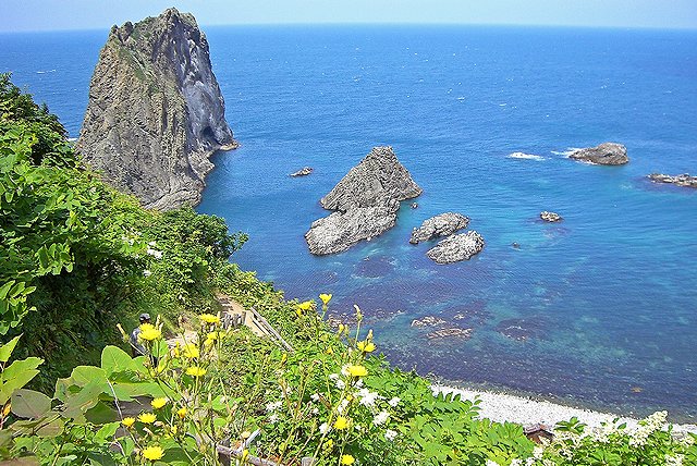もう一つの想像をはるかに超える美景スポットが「神威岬」。女人禁制の門から約770メートルの遊歩道を歩くと積丹ブルーの海と神威岩が見