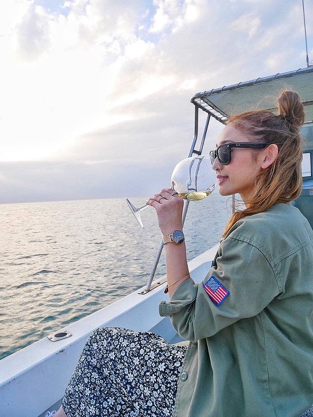 途中で氷を入れて飲むと、味と香りが変わるの。サンセットを見ながらのシャンパンは更に美味しくて。
