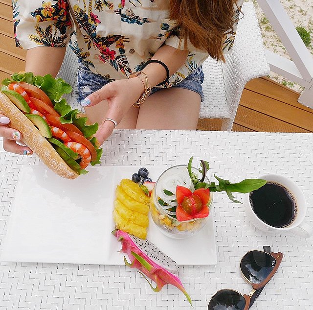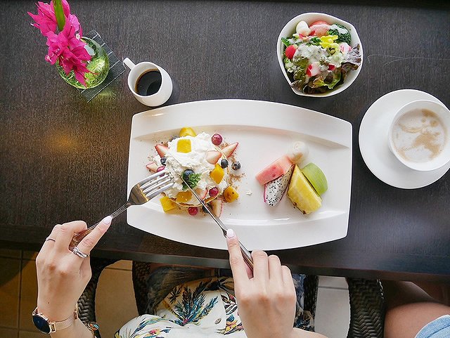 朝からビーチの目の前でブレックファースト。パンケーキ、エッグべネディクト、和食の中から選べます。