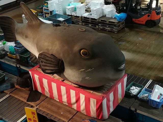 定休日で誰もいない市場の巨大なふぐオブジェが寂しげです。。。