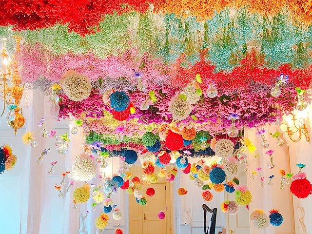 なかでもオススメの作品が、天井から降り注ぐフラワーポンポンがとても可愛らしい「マムとスターチスのシャワー」。