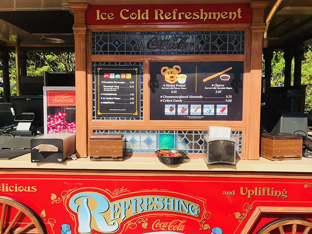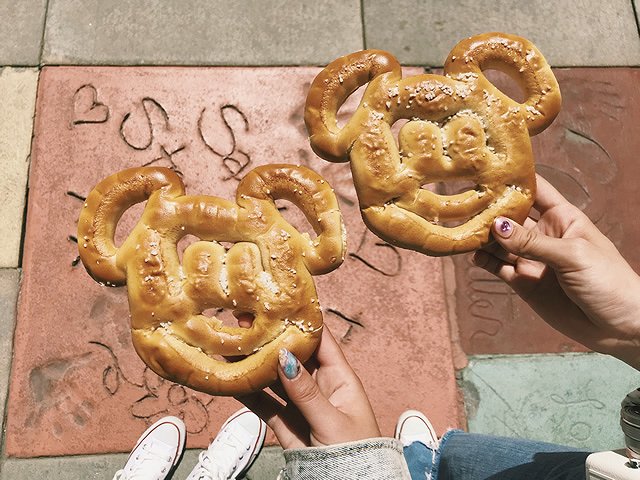おすすめのフードはミッキーの顔をかたどったプレッツェルです!アメリカならではのフードなので見てるだけでテンションが上がります。見た目も可愛いので持って写真を撮ると可愛いです!値段は6ドルで、野外のワゴンカーで購入可能です。プレッツェルももちもちでとても美味しく、チーズソースやマスタードを付けて食べます♪