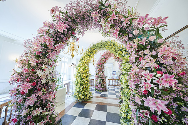 パレス館内に広がるゆりの芸術はフォトスポットとして大人気!美しいゆりの花々をお楽しみください。
