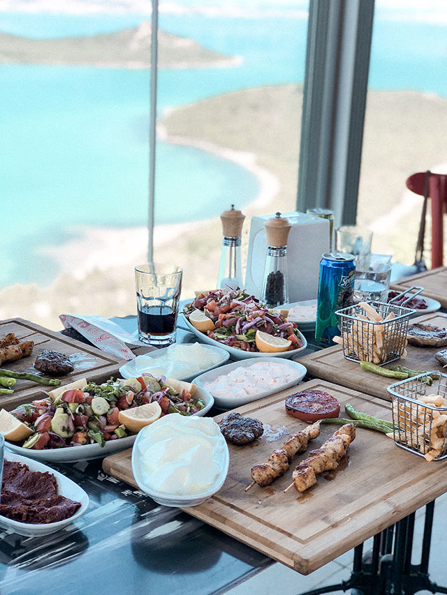 絶景を見ながらのランチ♡このレストランでは全面ガラス張りになっているから、どの席に座ってもエーゲ海を一望できるよ!