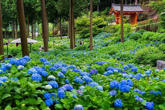 1万株のあじさいが杉木立の間に咲く様は紫絵巻のようで素晴らしい景観です。50種・1万株の西洋アジサイなどが咲き乱れ、「あじさい寺」とも称されていて、あじさいの名所として有名です。