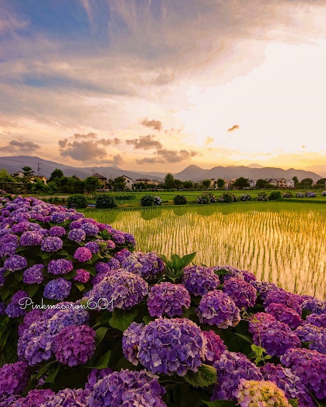 写真提供:@pinkmacaron601さん【投稿コメント(抜粋)】夕焼け空の田園風景と紫陽花*ずっと撮りたかった景色。夕焼けの暖かな光が一面に広がっていてとても綺麗でした。