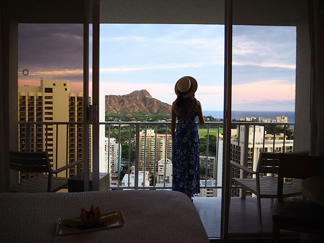 ハワイで欠かせないのがサンセット。ここアロヒラニホテルのお部屋からも