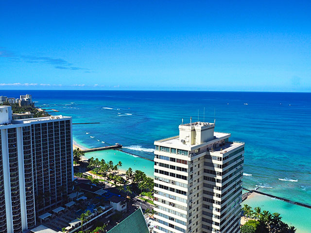建物と建物の間から見えるワイキキビーチを眺めながら