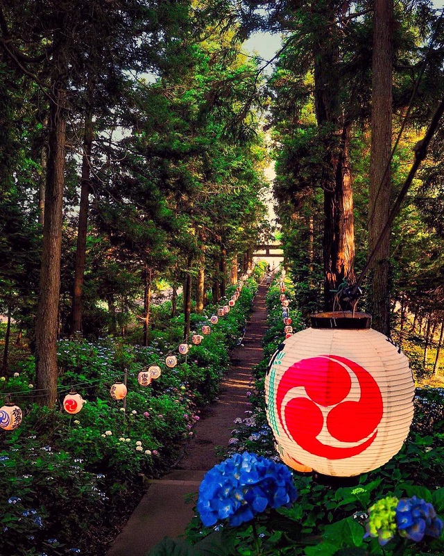 紫陽花に囲まれた参道を飾る、提灯がとても幻想的