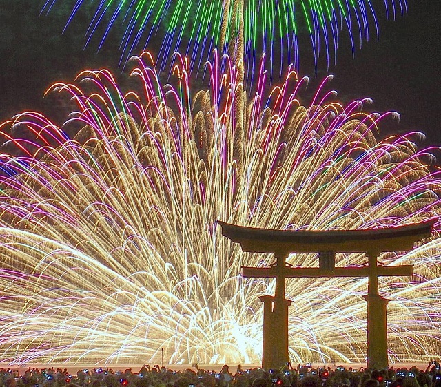 朱の大鳥居や嚴島神社の社殿を幻想的に浮かび上がらせ、なんとも日本らしさが溢れる花火大会です。※「西日本豪雨災害」により、来場者の輸送手段確保が困難となり安全が確保できない為、2018年の開催は中止となりました。