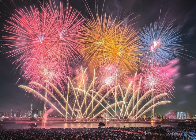 江戸時代の1733年に始まった伝統の「両国川開き花火大会」を継承する行事として、長年、人々に親しまれている花火大会。隅田川沿いの2つの会場から、合計で2万発も打ち上がる花火は、まさに壮大で95万人もの観覧客がつめかけます。 2012年からはスカイツリーと共に夜空を彩る花火を楽しむ事ができ、人気を集めています。 第1会場では、国内の代表的な花火大会で優秀な成績をおさめた花火師による花火コンクールが開催されます。