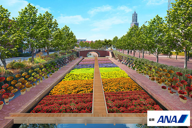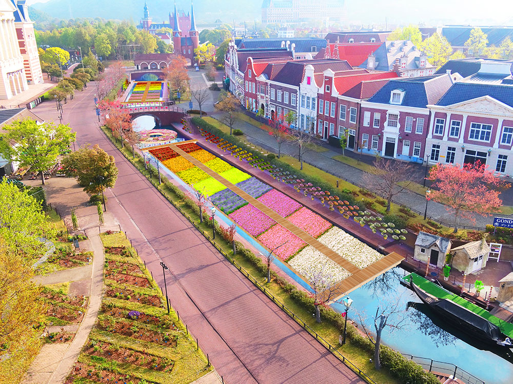 運河では、色とりどりの花々で敷き詰められた「虹色の散歩道」と、世界初・幅10mの巨大リース「幸せのフラワーリング」が登場し、この時期だけ花の絶景をお楽しみいただけます。