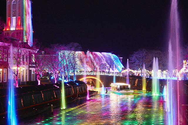 船が通ると始まる運河のイルミネーションショー。フォトスポットとしても大人気!虹の上を走っている気分になれる、ナイト運河クルーズもおすすめ。