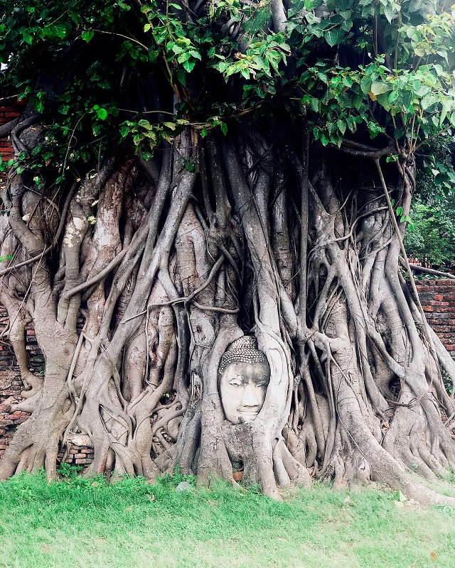 こちらの見どころは、何といっても樹木に包まれた仏頭です。ワット・マハタートは、アユタヤ王朝陥落時にビルマ軍に攻められ、仏像や寺院を徹底的に破壊されてしまいました。その後地面に転がっていた仏頭に、その場に根付いた木が包み込むように成長した、という説があります。実際に現地に行って、破壊されている仏像や寺院を見ると、この仏頭を見たときにとても心が動かされます。