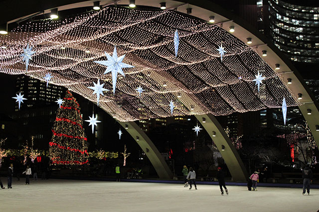 スケートリンク前には、「TORONTO(トロント)」のモニュメントと市庁舎(どちらも夜にはライトアップされます!)が建ち、さらには巨大なクリスマスツリーを見ながら滑ることができます。(スケートリンクは11月下旬~3月中旬10~22時までオープン)