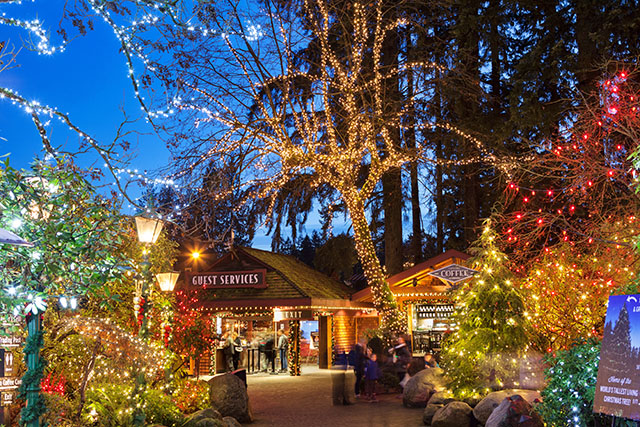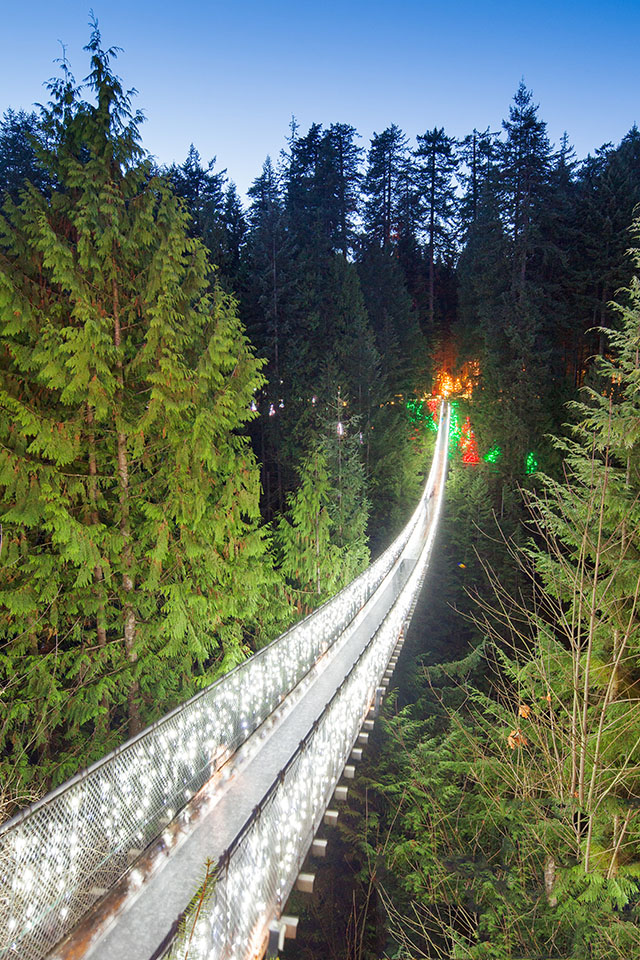 キャピラノ吊り橋は、森の中を空中散歩しているような大自然を満喫できるバンクーバー人気観光地のひとつです。この吊り橋がクリスマスになると、何千万のキラキラとした光が吊橋やクリフ・ウォークなど広場中をライトアップし、さらに壮観な光景が見られます!幻想的でインスタ映え間違いなし!別世界に入り込んだような感覚になり、冬ならではのキャピラノをお楽しみいただけます!