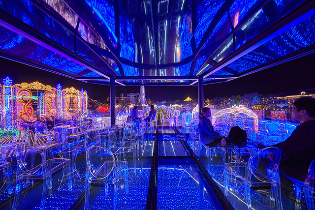 イルミネーションの上に立っているかのような体験ができる「光の天空カフェ」は、アートガーデンの輝きを天空から楽しめます。