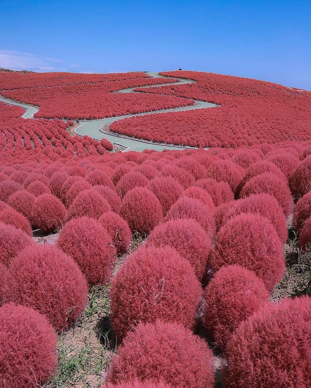 茨城県ひたちなか市にある国営公園、ひたち海浜公園は敷地面積200ヘクタールと広大で、四季折々に咲き誇る花々を楽しむ事ができます。初夏に青の花を咲かせるネモフィラと並んで、特に人気なのがコキア(ほうき草)です。約3.5ヘクタールの『みはらしの丘』をコキアが真っ赤に染め上げます。8月~9月には緑色のコキアが、秋の訪れと共に真っ赤に色づくのです。ふわふわ、もこもこした形がなんとも愛らしい景色が広がります。