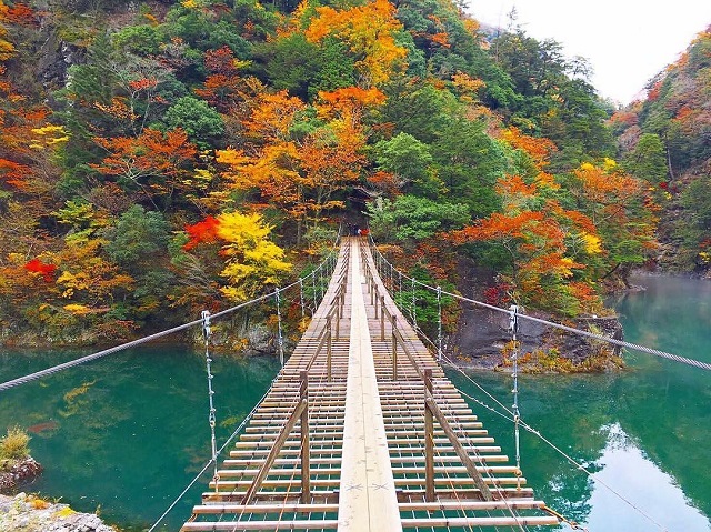 大間ダムでせき止められたエメラルドグリーンの湖面に架かる、長さ90m・高さ約8mの吊橋です。遊歩道の途中にはこの吊橋を見下ろす地点があり、絶好のカメラアングルとなっています!橋の中央付近で、恋の願いをすると、その恋が叶えられるという、ロマンチックな伝説を持つ橋として、若い女性やカップルに人気のスポット♪紅葉で彩られた「大間ダム」と青い湖に架かる「夢の吊橋」のコラボが見られるのはこの時期だけです!